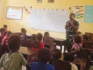 Kegiatan berlangsung dengan suasana penuh semangat. Para siswa terlihat antusias saat menjawab pertanyaan dan menyanyikan lagu-lagu kebangsaan bersama Babinsa. (Pendim 1710/Mimika)