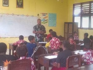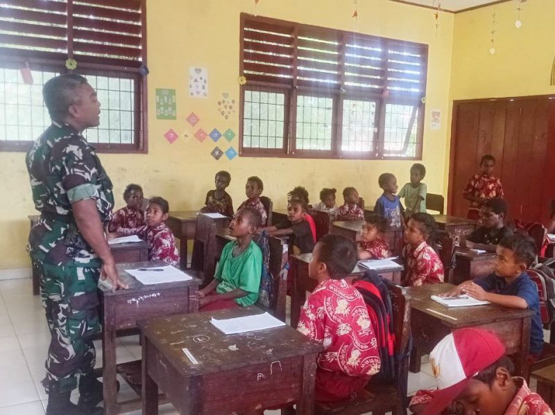 GENZANEWS.COM – Timika – Dalam upaya menumbuhkan semangat nasionalisme sejak usia dini, Babinsa Koramil 1710-07/Mapurujaya, Kodim 1710/Mimika, Peltu Hermanus Resubun, memberikan pembekalan Wawasan Kebangsaan (Wasbang) kepada para siswa SD YPPK Kaugapu, Distrik Mimika Timur, Jumat (31/10/2025).