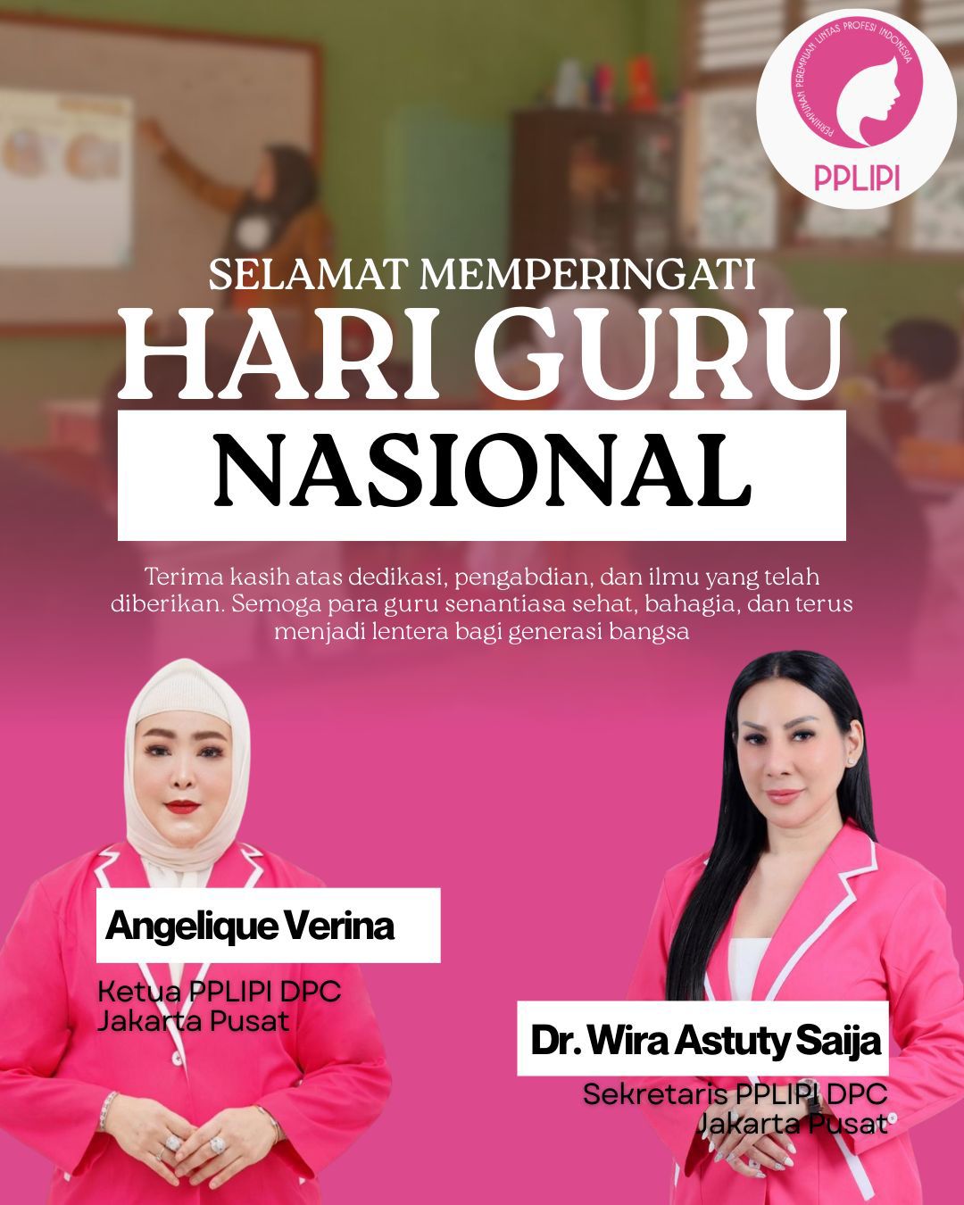 Di tengah peringatan Hari Guru Nasional (HGN) 2025, Selasa (25/11), Angelique Verina — Ketua PPLIPI DPC Jakarta Pusat — menyampaikan apresiasi mendalam kepada seluruh guru Indonesia. Angelique menegaskan bahwa rasa hormat dan ucapan terima kasih sederhana kepada guru adalah bentuk penghargaan yang sangat berarti.