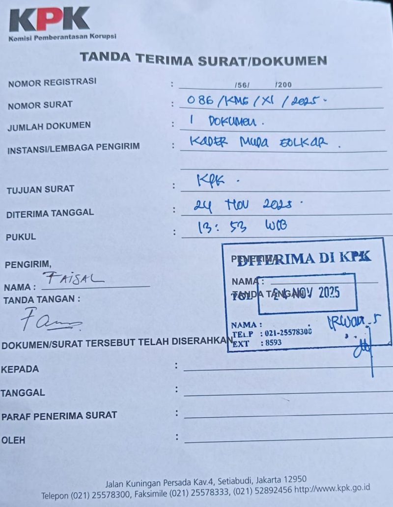 JAKARTA – GENZANEWS.COM – Kader Muda Golkar Faisal kembali mendatangi Gedung KPK Merah Putih meminta agar KPK menelusuri dugaan korupsi di Pemerintahan Kota Sorong.