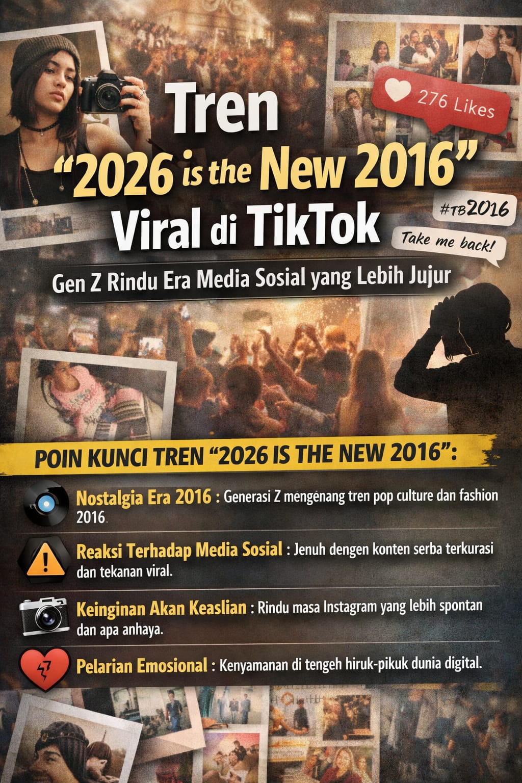 Jakarta,Genzanews.com — Jagat media sosial kembali diramaikan tren viral bertajuk “2026 is the New 2016” di platform TikTok. Tren ini bukan sekadar nostalgia biasa, melainkan sinyal kuat kelelahan Generasi Z terhadap wajah media sosial modern yang semakin artifisial, serba terkurasi, dan menuntut kesempurnaan.